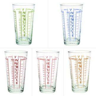 Verre doseur en verre très haute résistance, graduation ne s'efface pas au lave vaisselle, mesures en Français, existe en 6 coloris (selon disponibilités)