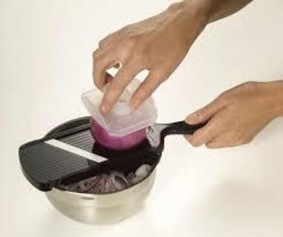 Mandoline réglable (4 épaisseurs de coupe) en céramique avec bloc protège doigts.