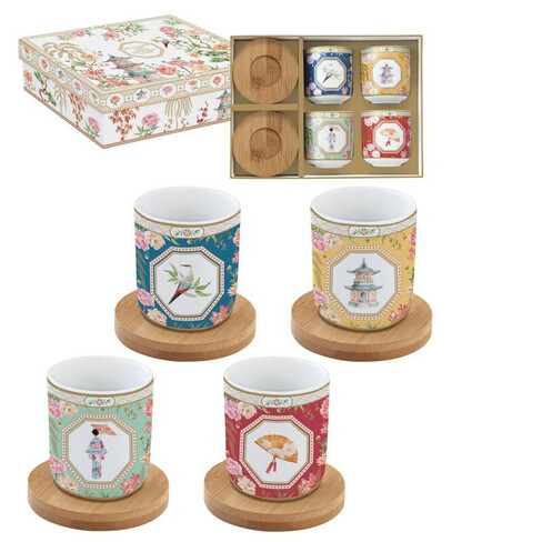 Coffret 4 tasses café 10cl en porcelaine avec sous tasses en bambou - comptatibles lave vaisselle et micro onde - présentée en boite cadeau