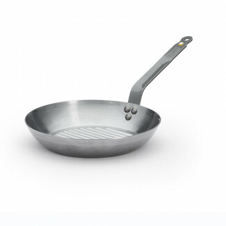 Fond strié pour marquer la viande et réduire la surface d'accorche des viandes. Pas de revêtement, possible de couper directement dans la poêle.