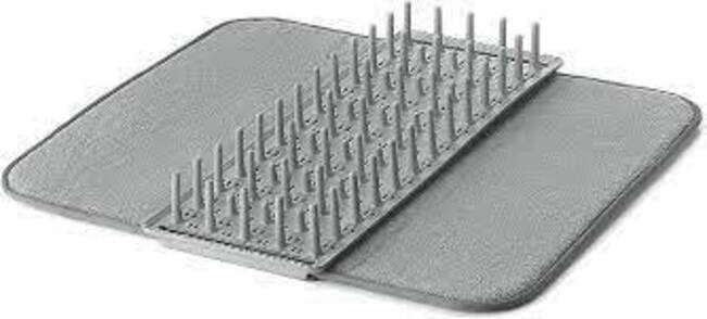 - De plus, il est peu encombrant car il suffit d’enrouler le tapis autour de l’égouttoir et de le fixer avec la sangle élastique intégrée pour réduire considérablement sa taille et le ranger facilement dans un placard ou sous l’évier.