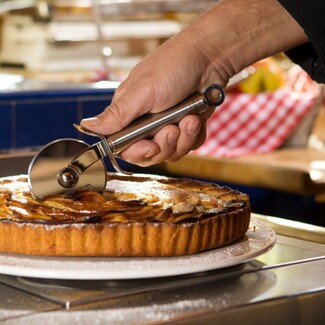 La grande roulette affûtée garantit la découpe droite des pizzas sans en abîmer la garniture, même de celles à pâte épaisse.