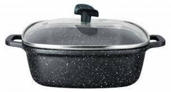 Faitout carré façon pierre 24x24 cm. Qualité supérieure - garanti indéformable et d'une durée de vie plus longue. Structure en fonte d'aluminium avec un revêtement "façon pierre" permettant de conserver le goût authentique des aliments et de laver très facilement le produit. Cuisson tous feux dont induction. Homogénéité de cuisson sans ajout de matière grasse. Deux poignées en silicones sont incluses pour une meilleur confort lors de l'utilisation. Très beau couvercle en verre.