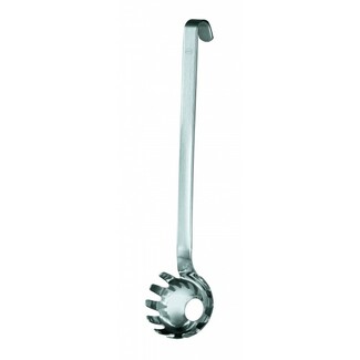 Les dents profondes et arrondies servent une bonne portion de spaghetti. Le trou au fond de la cuillère permet aux liquides de s’égoutter mais également de mesurer une portion de spaghetti.