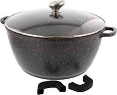 Faitout diamètre 36 cm avec couvercle en verre. Structure en fonte d'aluminium compatible tous feux dont induction, revêtement anti-adhèrent Pierre, sans PFOA. Deux poignées en silicone sont incluses pour un meilleur confort lors de l'utilisation. Gamme PREMIUM.