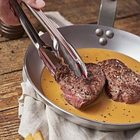 Pince cafétéria en acier inoxydable avec embouts « feuilles de chêne », idéale pour le service de nombreux plats tels que les salades, les pièces de viande ou encore les petits fours.