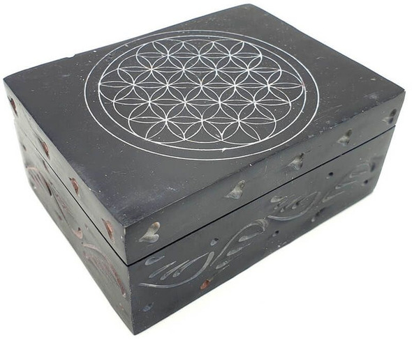 Boîte à bijoux en pierre de Saponite, motif fleur de vie 10x8 cm.