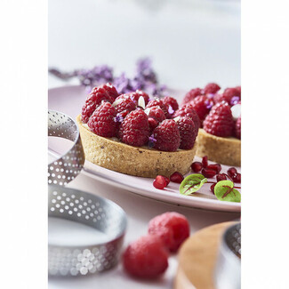 Cercle à tarte perforé rond en acier inoxydable idéal pour les tartes, tartelettes, tourtes et quiches, développé en partenariat avec l’Ecole du Grand Chocolat Valrhona.