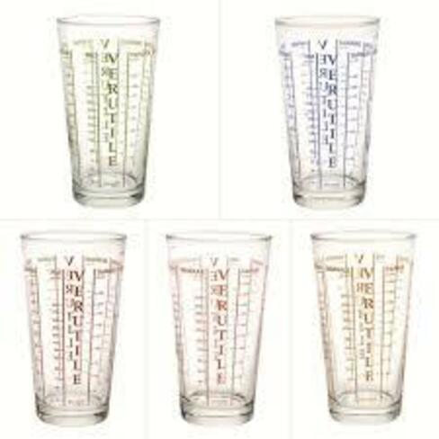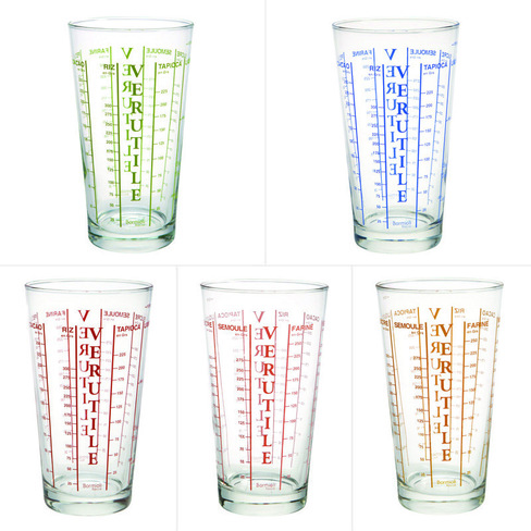 Verre doseur en verre très haute résistance, graduation ne s'efface pas au lave vaisselle, mesures en Français, existe en 6 coloris (selon disponibilités)