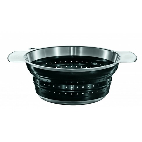 Pour égoutter des légumes, des féculents et pour laver les salades. Les perforations tout autour garantissent un égouttage rapide. Fond avec 3 pieds. Grâce au corps en silicone, la passoire peut être pliée pour atteindre une hauteur de 4 cm. Pratique pour le rangement et ainsi gagner de la place.