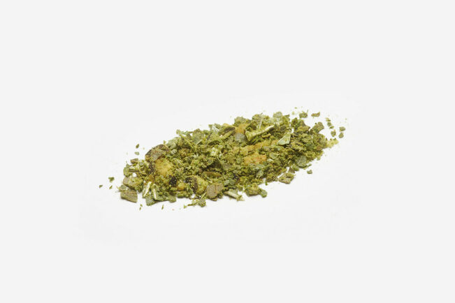 Graines de courges toastées (52%), basilic (14%), fromage en poudre (lait écrémé en poudre) (LAIT), sel, ail, huile d’olive, menthe, fenugrec.