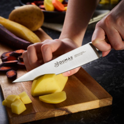 Ce couteau permet d’émincer, trancher, découper finement tous les ingrédients et notamment les légumes et les herbes, mais aussi la viande ce qui en fait un incontournable de tous les cuisiniers. Sa grande hauteur de la lame et sa garde lui apportent une rigidité et une précision qui lui confèrent une coupe nette.