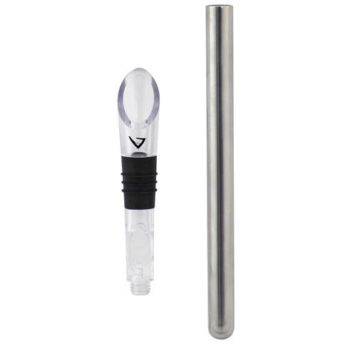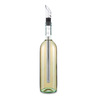 Bouchon verseur en plastique avec joint en silicone qui s'adapte à toutes les tailles de bouteille, équipé d'une tige refroidissante en acier inox qui conserve le froid jusqu'à deux heures.