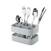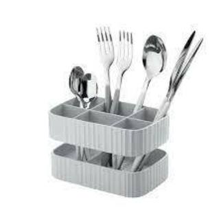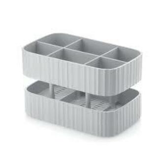 Égouttoir à couverts pratique et compact avec six compartiments et deux hauteurs différentes pour séparer les différents couverts. Avec bac de récupération d’eau. Facile à nettoyer, il passe au lave-vaisselle et se démonte en trois pièces.