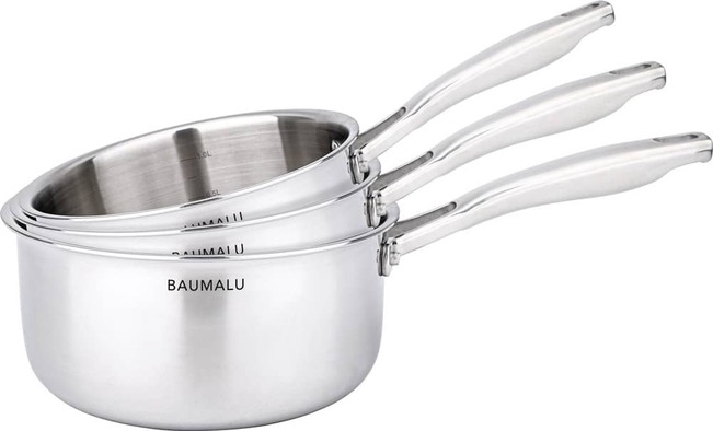 Le set de 3 casseroles de la gamme Triplinox de Baumalu allie efficacité, robustesse et cuisson saine. Grâce à sa construction tripli (inox intérieur / cœur aluminium / inox magnétique extérieur), elle offre une montée en température rapide, une diffusion homogène de la chaleur et une parfaite maîtrise de la cuisson, tout en étant éco-énergétique.