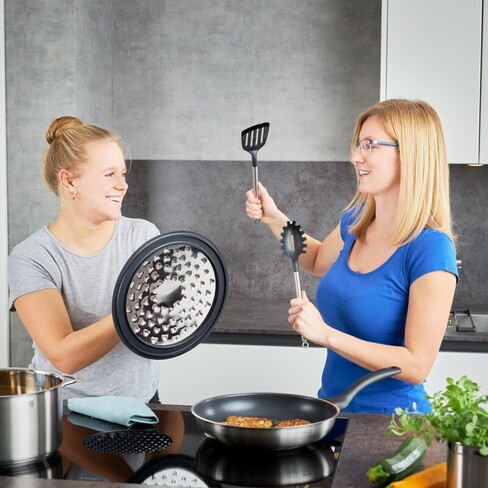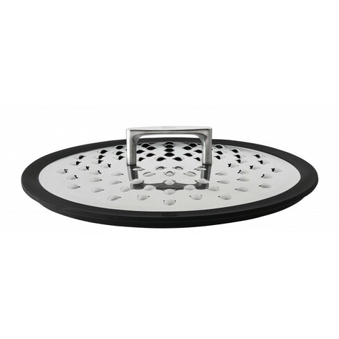 En acier inoxydable 18/10, avec des petites sorties d'air et bord en silicone (résistant à une température de 260°C) Convient à toutes les poêles à frire, braisières et poêles de service, aux faitouts et aux saladiers d'un diamètre de 24 et 28 cm.