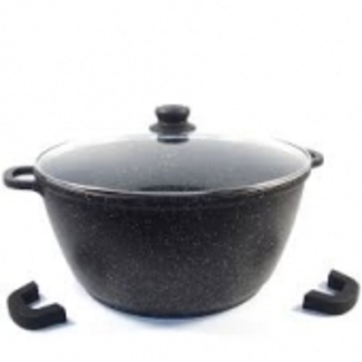 Faitout diamètre 32 cm avec couvercle en verre. Structure en fonte d'aluminium compatible tous feux dont induction, revêtement anti-adhèrent Pierre, sans PFOA. Deux poignées en silicone sont incluses pour un meilleur confort lors de l'utilisation. Gamme PREMIUM.