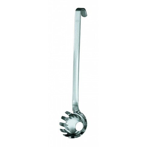 Les dents profondes et arrondies servent une bonne portion de spaghetti. Le trou au fond de la cuillère permet aux liquides de s’égoutter mais également de mesurer une portion de spaghetti.